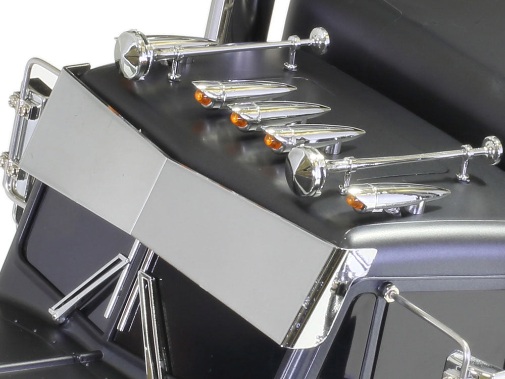 Take control of your very own big rig - this R/C model assembly kit recreates a massive boxy, customized truck like those seen in North America. Body parts are given a sumptuous finish, pre-painted in metallic black and with a matte top coat that contrasts superbly with the numerous metal-plated parts. The model's ladder frame chassis features aluminum side channels with resin cross members and is equipped with a highly realistic suspension utilizing metal leaf springs and dampers. A front-mounted motor and 3-speed transmission power the two rear wheel axles, which are fitted with built-in differentials to enable smooth cornering. A 4-channel R/C system and multi-function unit allow you to drive the vehicle and experience realistic lights, sounds and vibrations.