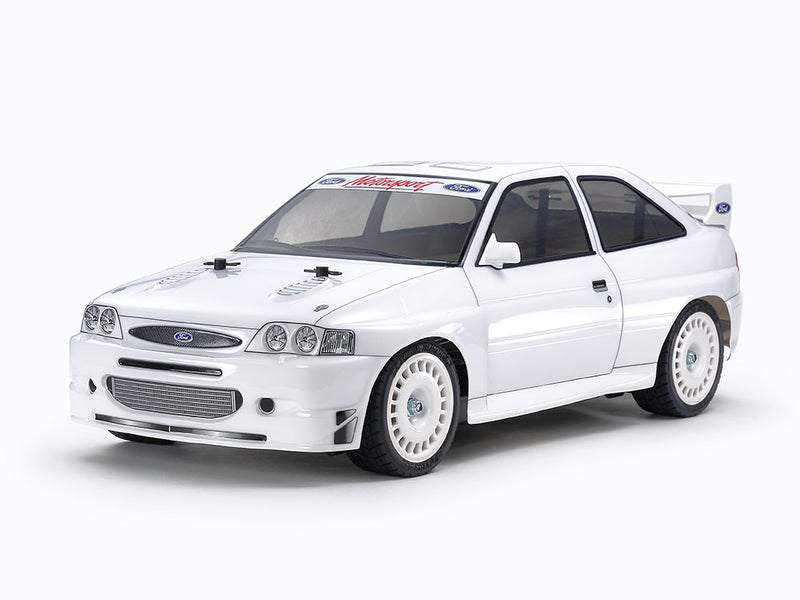 This R/C model assembly kit recreates a three-door hatchback Ford Escort Mk.6 with customizations such as blister fenders, front spoiler and rear wing. The powerful form is captured by a lightweight and durable polycarbonate body, and stickers are included to add detail. The model is based upon the adaptable and user-friendly TT-02 chassis, which offers shaft-driven 4WD.