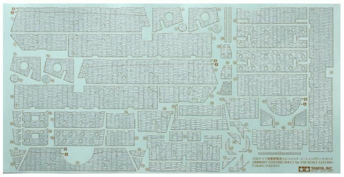 Simulating Zimmerit on military models using putty enhances the model"s presence but at the same time it requires advanced skills and is time consuming. The Tamiya sticker sheet enables easy reproduction of Zimmerit on the separately available 1/35 scale German Heavy Tank Destroyer Elefant. By simply applying the stickers on the Model and then painting, a realistic Zimmerit effect can be achieved. Two different coating patterns are included to match the kit-included marking options.