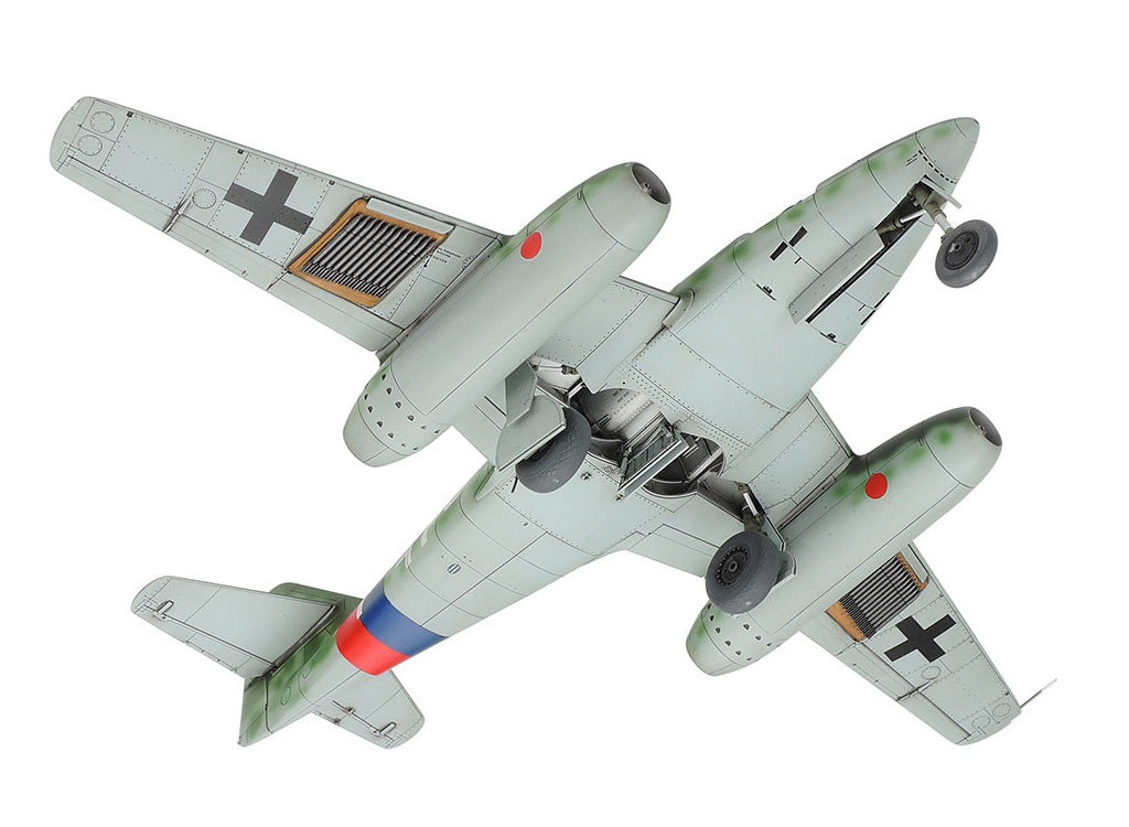 Tamiya presents the plastic assembly kit of the Messerschmitt Me262 that was used by the Luftwaffe during the closing days of WWII. 1/48 Scale, Overall Length: 221mm, Overall Width: 264mm. The unique form of the Me262 with its engine nacelles under each wing has been accurately replicated. The 4 X 30mm cannon mounted in the nose and cockpit have been reproduced down to the finest details. Canopy and gun bay access panels can be mounted in either open or closed position. R4M air-to-air rockets with launchers to be mounted under the wings and W.Gr 21 air-to-air rocket-launchers to be assembled under the nose are part of the kit. Nose wheel well comes as a die-cast weight. A pilot figure and decals for 4 different markings are included in the kit.
