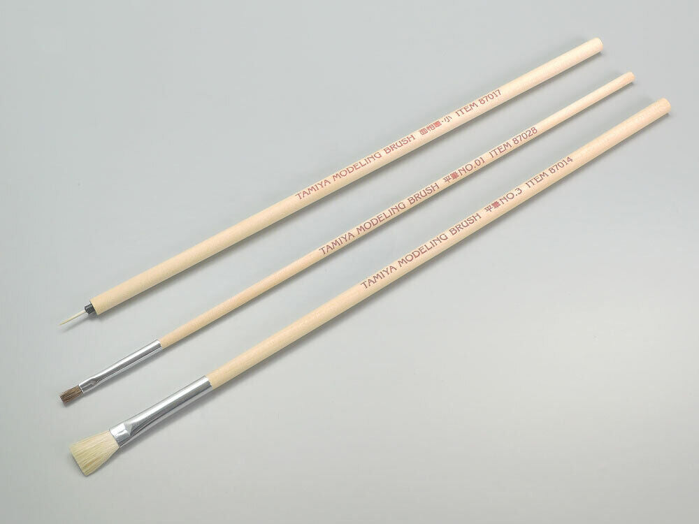 This handy set includes three different paint brushes commonly required in the finishing of plastic models. These include No.3 (8mm width) and No.01 (3mm) flat brushes, plus a small pointed brush for fine detail. The horse-hair bristle brushes feature a wooden handle designed to reduce strain on the hand.
